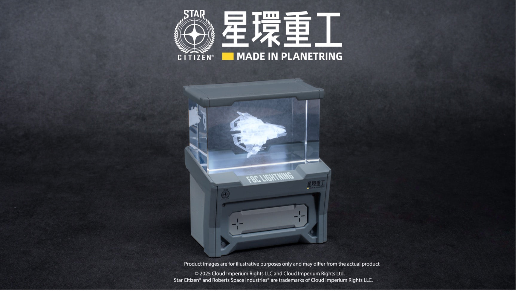 The pre-order bonus is a crystal block with internal 3D laser engraving, featuring the F8C Lightning in flight mode, mounted on a light-up display base.
